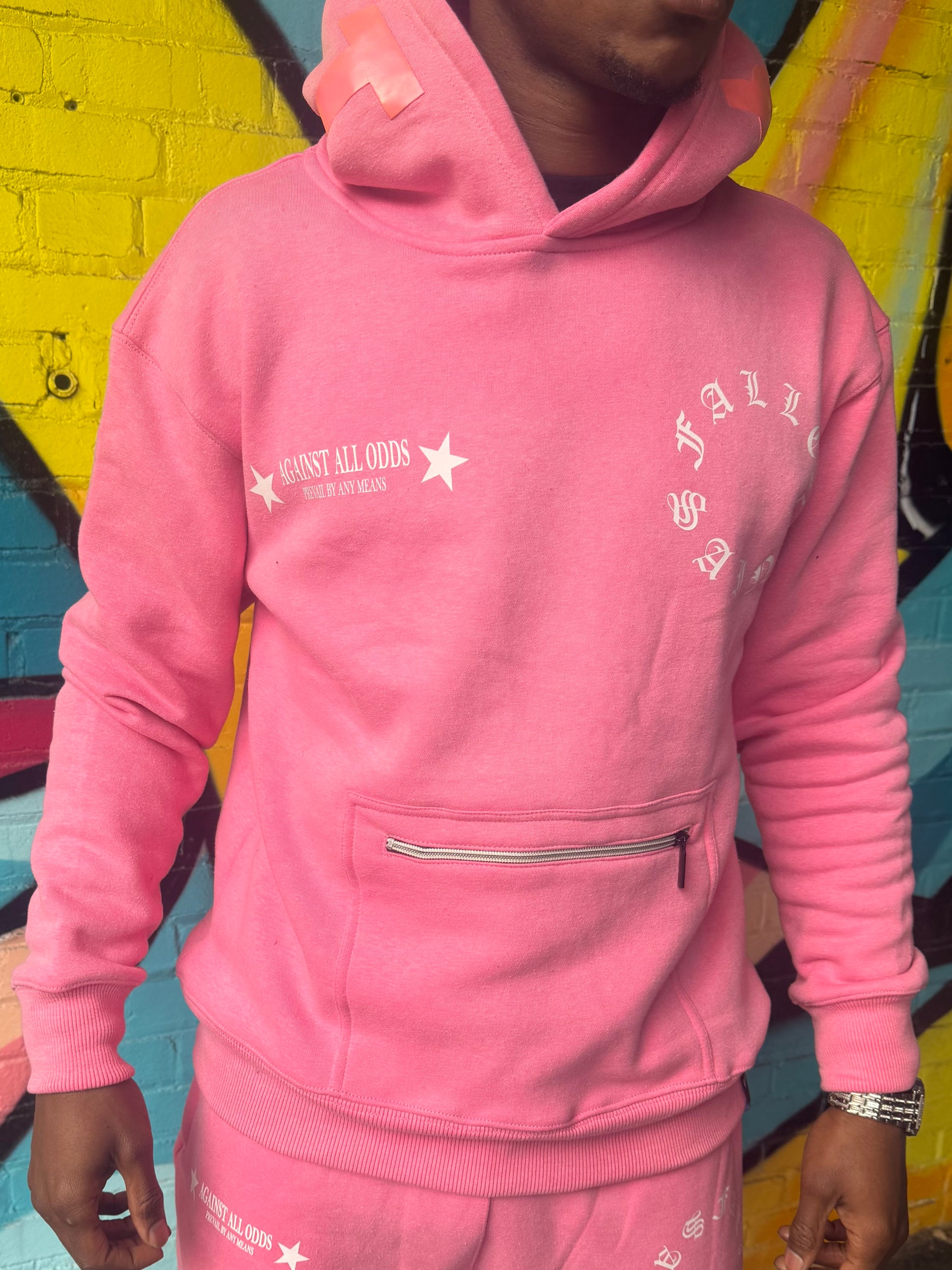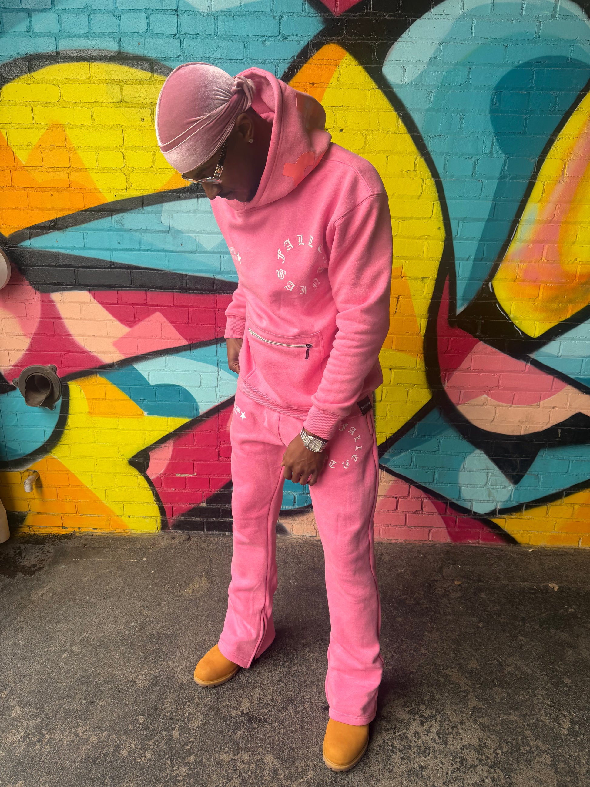 Harlem Pink. Acid wash. Exclusive zipper pouch on hoodie. Stacked joggies with zipper option. 350GSM fabric. (This item pays special homage to the Harlem rapper, Cam’ron)