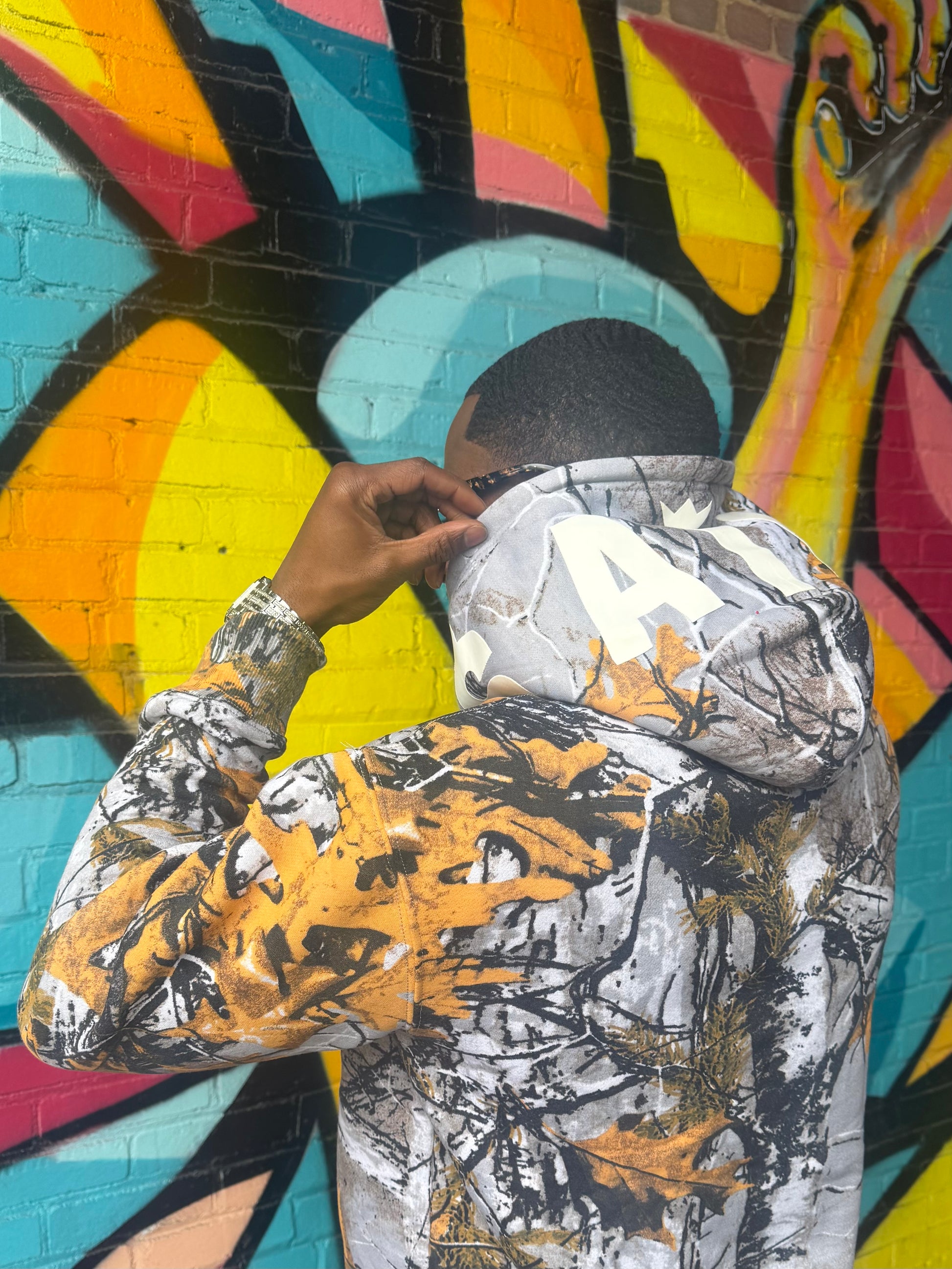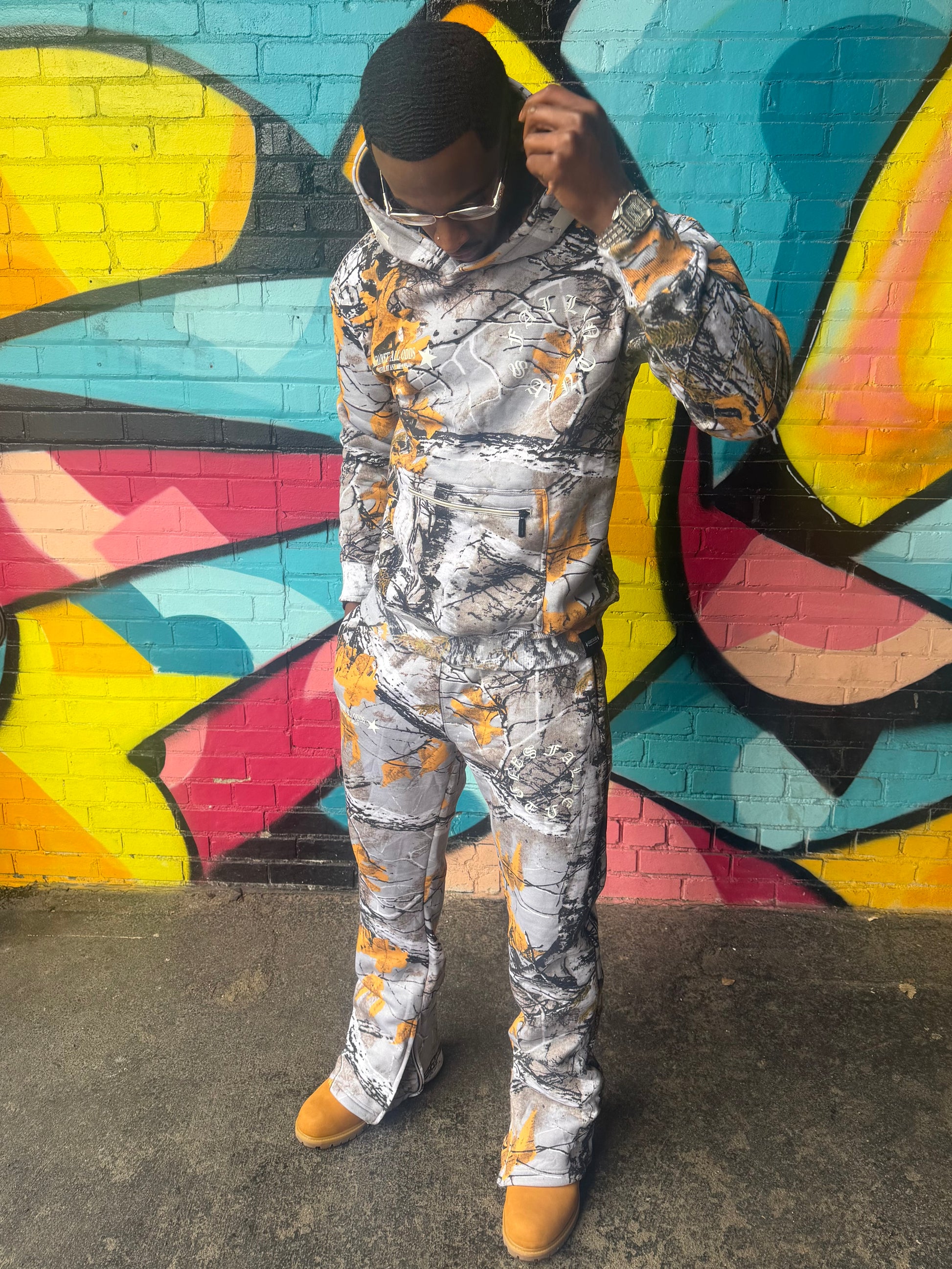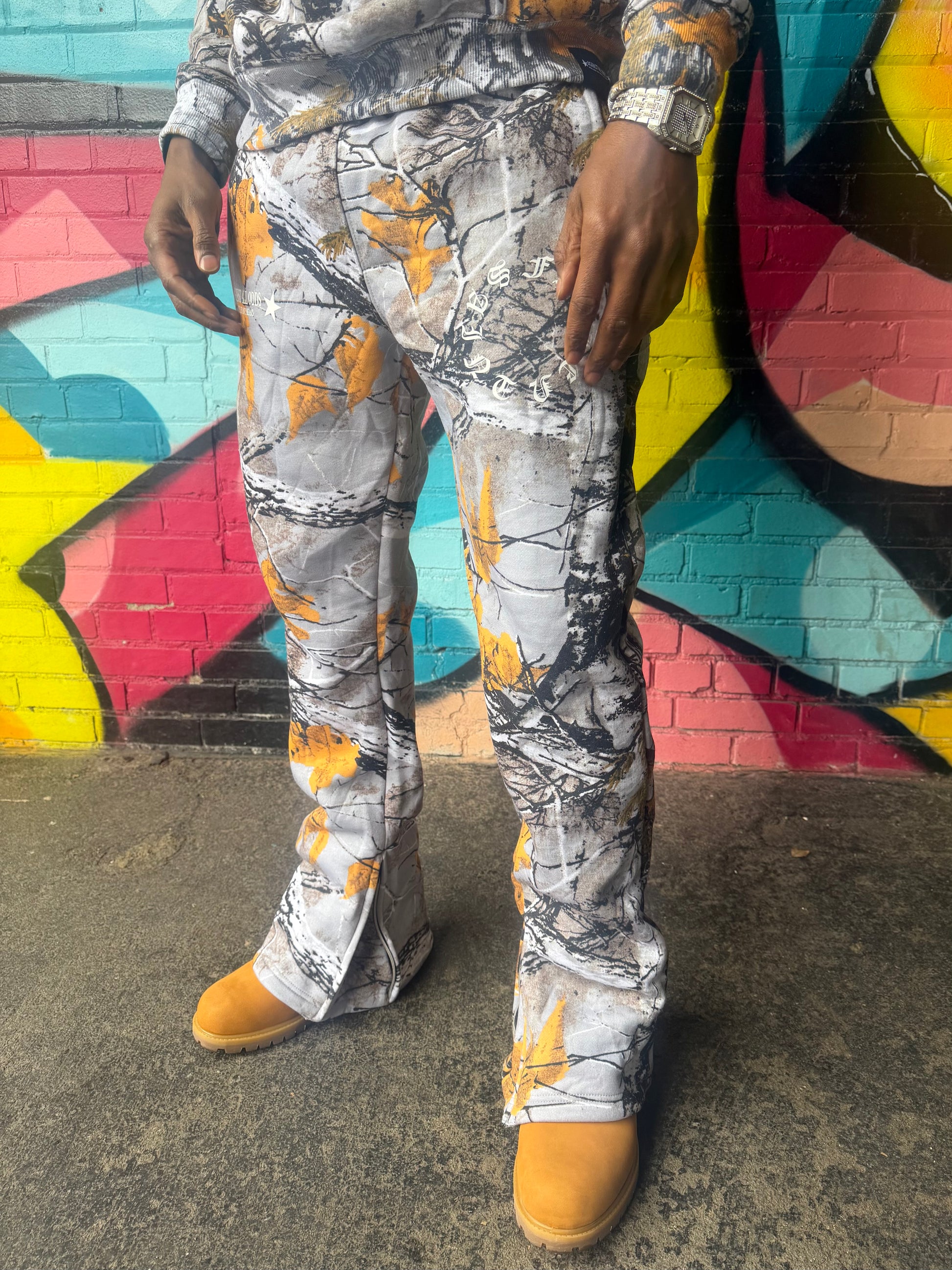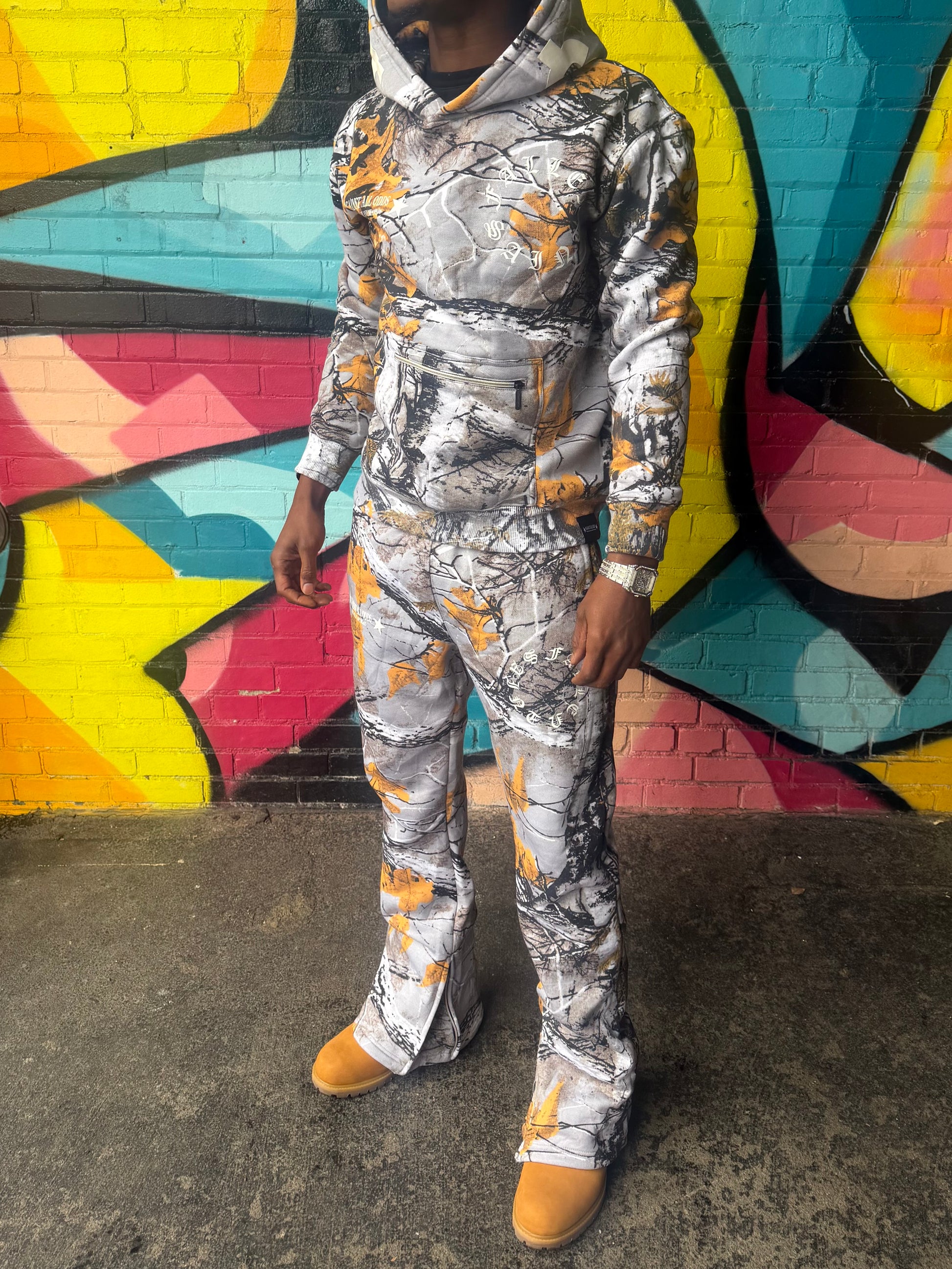 Hunter Camo. Exclusive zipper pouch on hoodie. Stacked joggies with zipper option. 400GSM fabric.